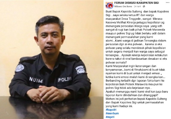 “Buat Bapak Kapolda Sulteng dan Bapak Kapolres Sigi, saya selaku Ketua RT dan warga masyarakat Desa Tinggede sangat merasa kecewa melihat kinerja petugas kepolisian yang menangani persoalan warga kami. Kami sangat dirugikan, baik oleh Polsek Marawola maupun Polres Sigi yang tidak berlaku adil dalam menangani permasalahan yang kami alami.Warga kami dijadikan tersangka dalam persoalan dengan eks Polwan karena ia terus mendesak pihak kepolisian untuk segera menetapkan warga kami sebagai tersangka. Apakah kinerja kepolisian takut diviralkan karena desakan eks Polwan semata?Kami masyarakat ingin ketenangan dan kenyamanan. Kami difitnah, dibuat tidak nyaman, dan dibuat emosi. Ketika kami emosi, justru kami disangkakan.Laporan fakta yang kami buat, baik ke Polsek Marawola maupun ke Polres Sigi, tidak ada kejelasannya. Apakah harus menunggu viral baru laporan kami diindahkan dan ditanggapi?Mohon ini menjadi perhatian Bapak Kapolda Sulteng dan Bapak Kapolres Sigi terhadap permasalahan yang kami hadapi.”