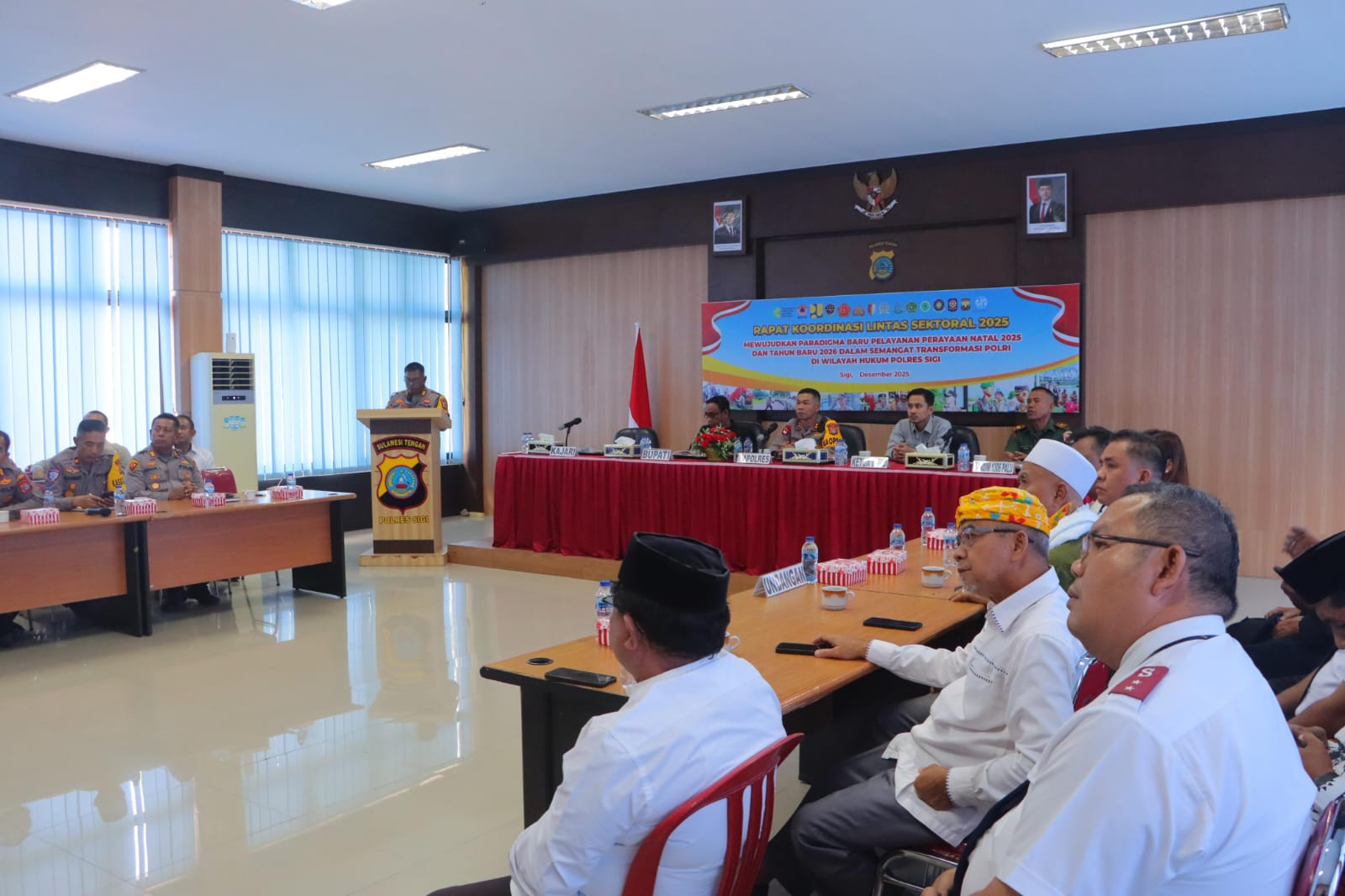 SIGI – Guna menyamakan persepsi dalam rangka pelayanan dan pengamanan Perayaan Natal 2025 serta Tahun Baru 2026, Polres Sigi menggelar Rapat Koordinasi (Rakor) Lintas Sektoral Operasi Lilin Tinombala 2025 di Aula Simpotove Polres Sigi, Jumat (19/12/2025).